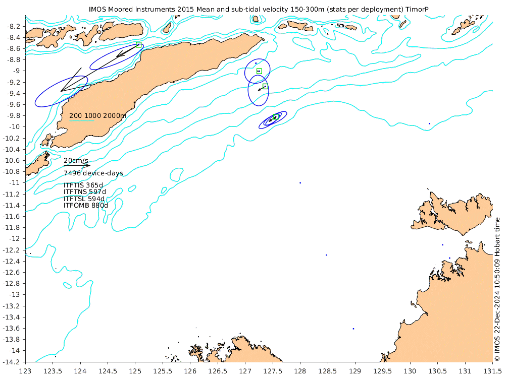 These maps show some basic analyses of the velocity data: mean (all-time in black and seasonal in colour) and sub-tidal variance for several layers and time-windows, and tidal harmonics for the depth-average velocity using the whole record. Click through to see more detailed plots of the selected dataset or to download those data from the AODN thredds server.