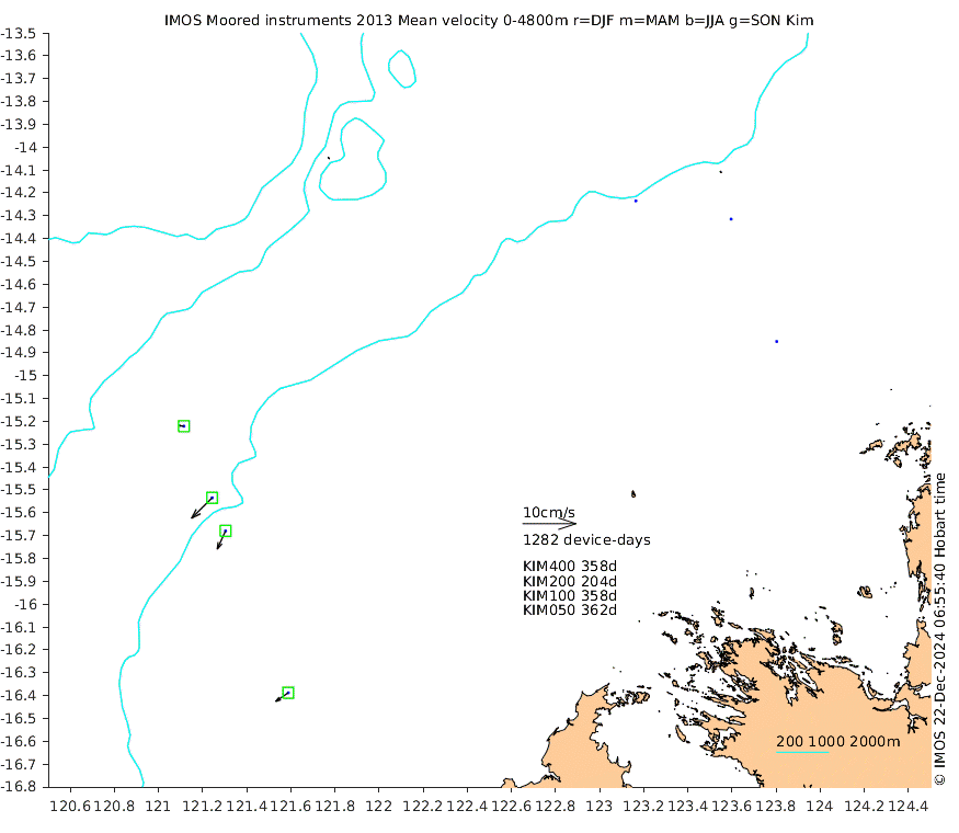 These maps show some basic analyses of the velocity data: mean (all-time in black and seasonal in colour) and sub-tidal variance for several layers and time-windows, and tidal harmonics for the depth-average velocity using the whole record. Click through to see more detailed plots of the selected dataset or to download those data from the AODN thredds server.