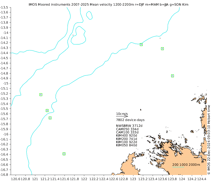 These maps show some basic analyses of the velocity data: mean (all-time in black and seasonal in colour) and sub-tidal variance for several layers and time-windows, and tidal harmonics for the depth-average velocity using the whole record. Click through to see more detailed plots of the selected dataset or to download those data from the AODN thredds server.