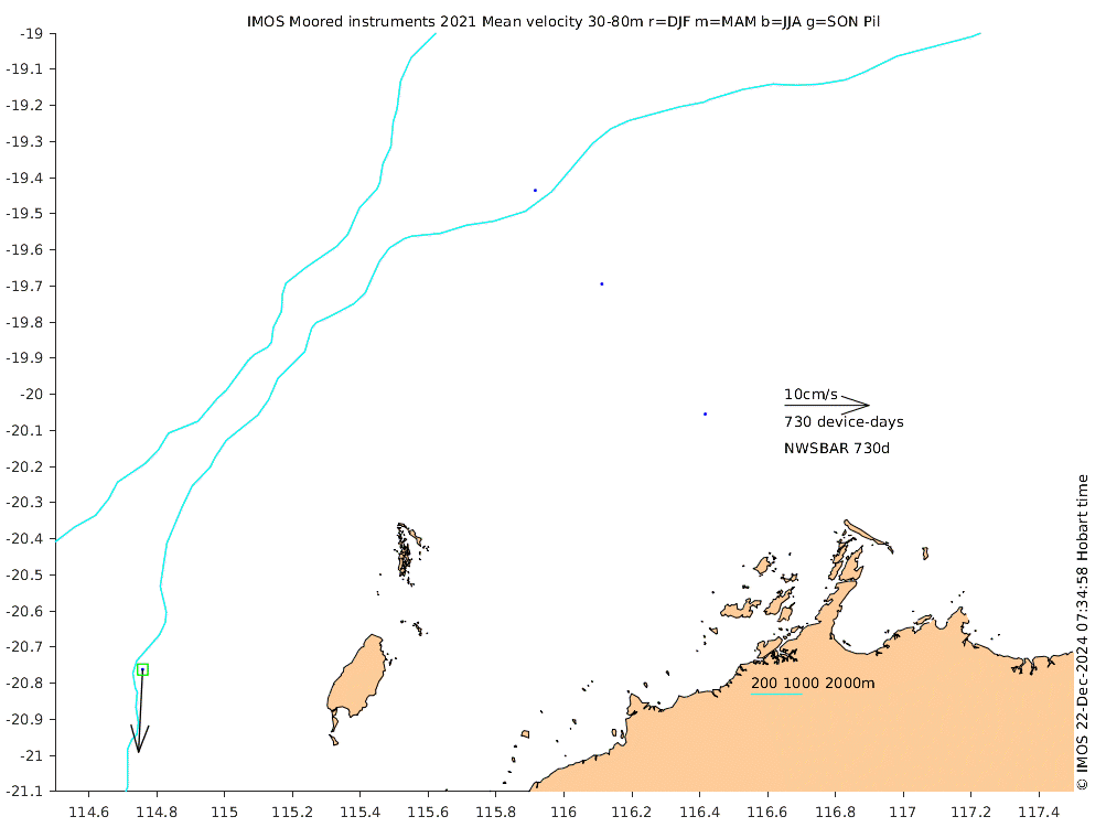 These maps show some basic analyses of the velocity data: mean (all-time in black and seasonal in colour) and sub-tidal variance for several layers and time-windows, and tidal harmonics for the depth-average velocity using the whole record. Click through to see more detailed plots of the selected dataset or to download those data from the AODN thredds server.