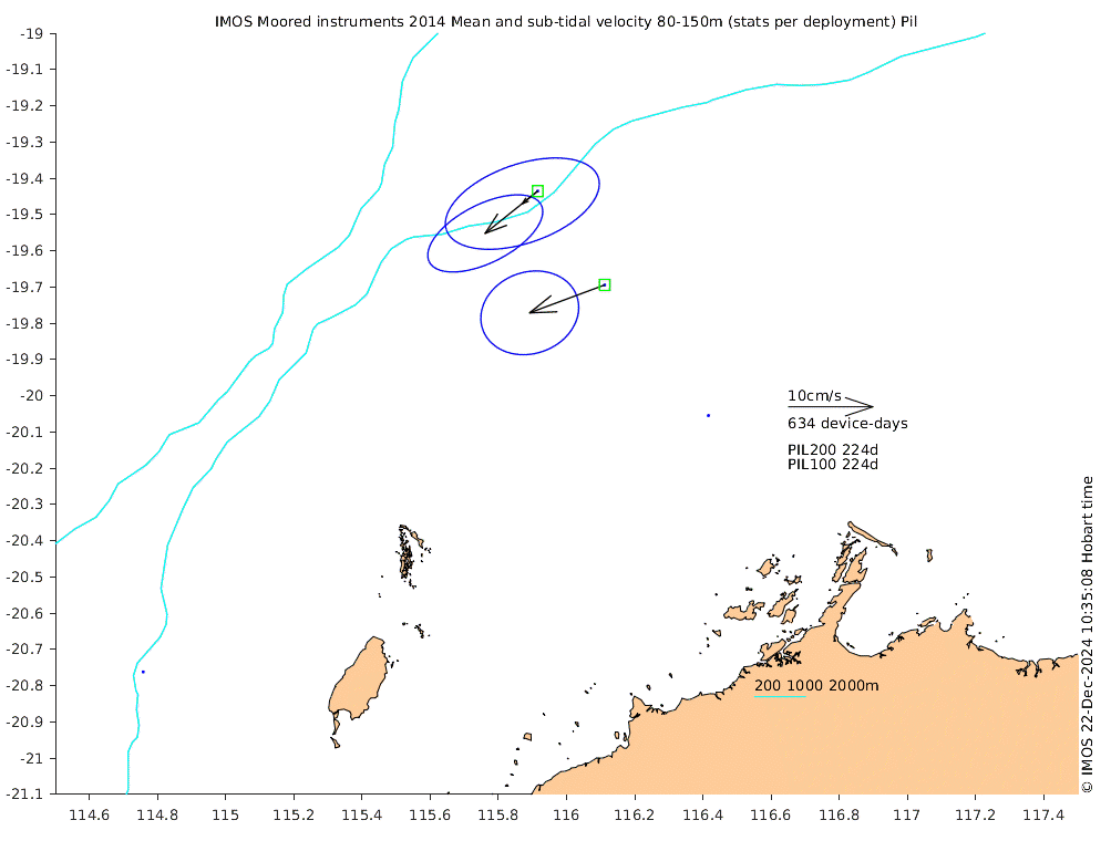 These maps show some basic analyses of the velocity data: mean (all-time in black and seasonal in colour) and sub-tidal variance for several layers and time-windows, and tidal harmonics for the depth-average velocity using the whole record. Click through to see more detailed plots of the selected dataset or to download those data from the AODN thredds server.