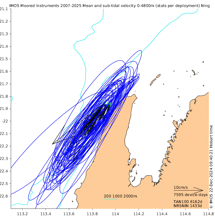 These maps show some basic analyses of the velocity data: mean (all-time in black and seasonal in colour) and sub-tidal variance for several layers and time-windows, and tidal harmonics for the depth-average velocity using the whole record. Click through to see more detailed plots of the selected dataset or to download those data from the AODN thredds server.