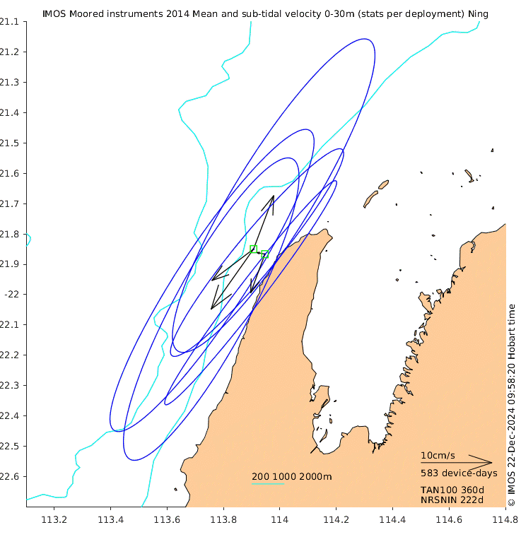 These maps show some basic analyses of the velocity data: mean (all-time in black and seasonal in colour) and sub-tidal variance for several layers and time-windows, and tidal harmonics for the depth-average velocity using the whole record. Click through to see more detailed plots of the selected dataset or to download those data from the AODN thredds server.