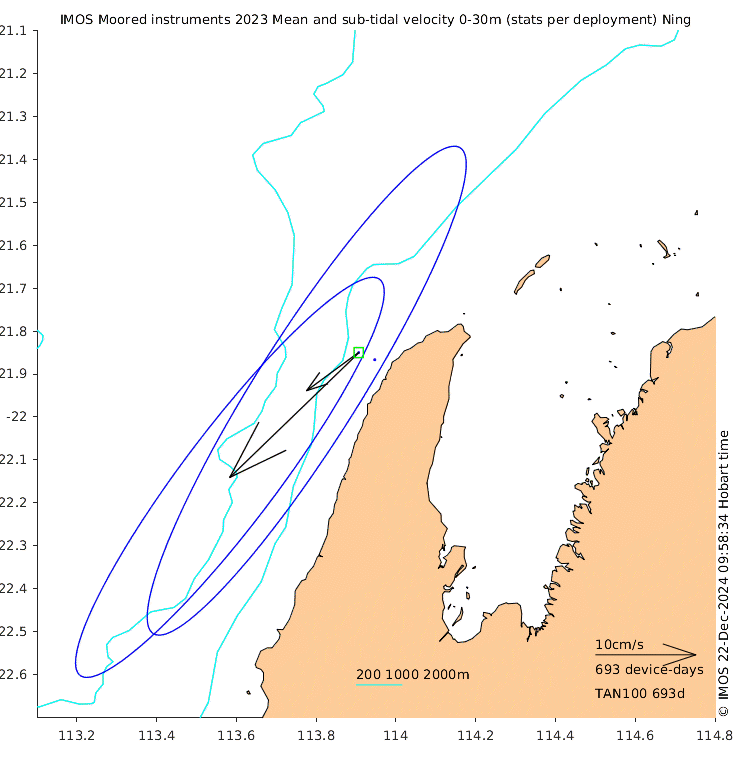 These maps show some basic analyses of the velocity data: mean (all-time in black and seasonal in colour) and sub-tidal variance for several layers and time-windows, and tidal harmonics for the depth-average velocity using the whole record. Click through to see more detailed plots of the selected dataset or to download those data from the AODN thredds server.