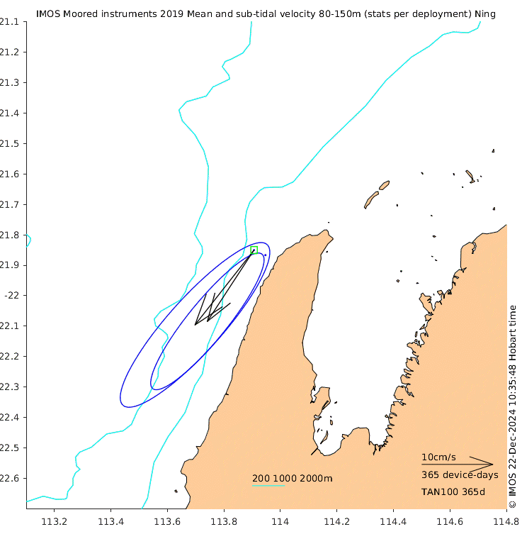 These maps show some basic analyses of the velocity data: mean (all-time in black and seasonal in colour) and sub-tidal variance for several layers and time-windows, and tidal harmonics for the depth-average velocity using the whole record. Click through to see more detailed plots of the selected dataset or to download those data from the AODN thredds server.
