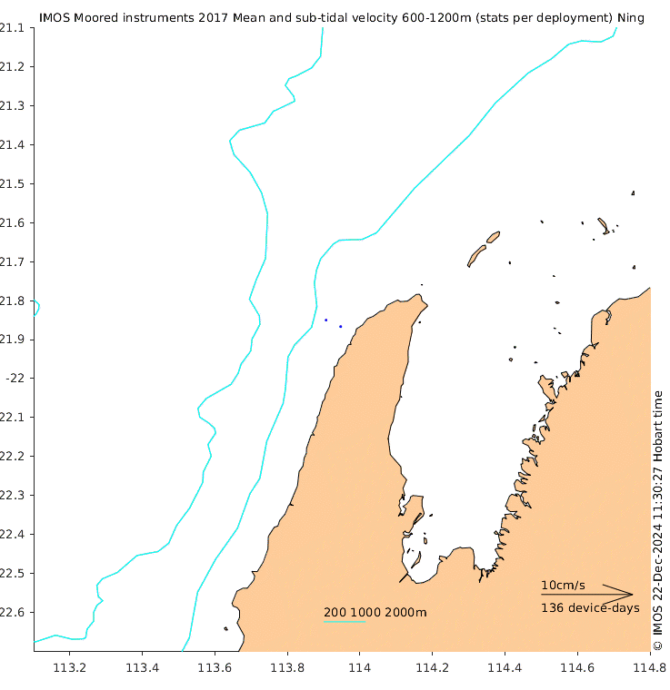 These maps show some basic analyses of the velocity data: mean (all-time in black and seasonal in colour) and sub-tidal variance for several layers and time-windows, and tidal harmonics for the depth-average velocity using the whole record. Click through to see more detailed plots of the selected dataset or to download those data from the AODN thredds server.