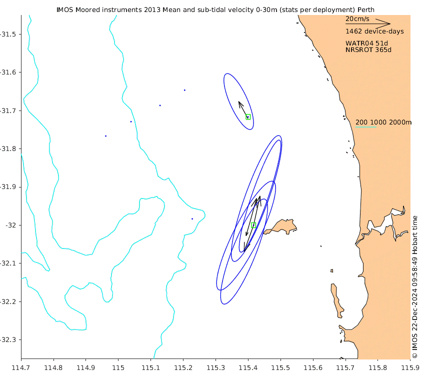 These maps show some basic analyses of the velocity data: mean (all-time in black and seasonal in colour) and sub-tidal variance for several layers and time-windows, and tidal harmonics for the depth-average velocity using the whole record. Click through to see more detailed plots of the selected dataset or to download those data from the AODN thredds server.