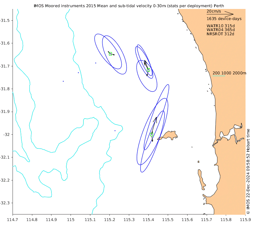 These maps show some basic analyses of the velocity data: mean (all-time in black and seasonal in colour) and sub-tidal variance for several layers and time-windows, and tidal harmonics for the depth-average velocity using the whole record. Click through to see more detailed plots of the selected dataset or to download those data from the AODN thredds server.