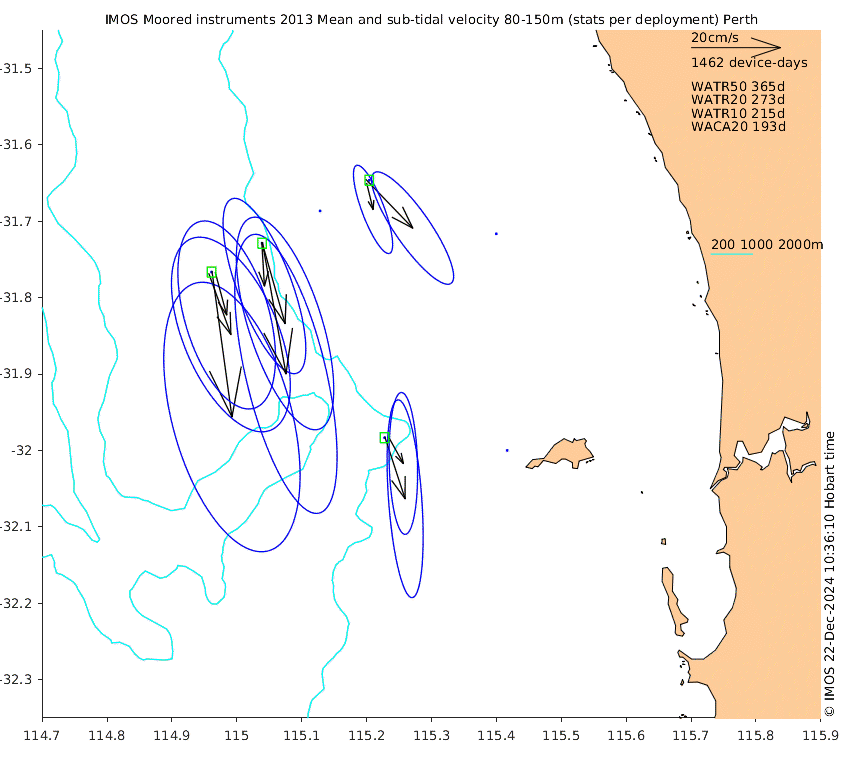 These maps show some basic analyses of the velocity data: mean (all-time in black and seasonal in colour) and sub-tidal variance for several layers and time-windows, and tidal harmonics for the depth-average velocity using the whole record. Click through to see more detailed plots of the selected dataset or to download those data from the AODN thredds server.