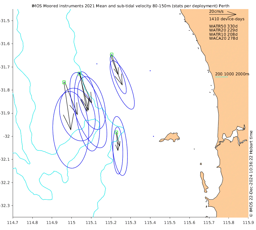 These maps show some basic analyses of the velocity data: mean (all-time in black and seasonal in colour) and sub-tidal variance for several layers and time-windows, and tidal harmonics for the depth-average velocity using the whole record. Click through to see more detailed plots of the selected dataset or to download those data from the AODN thredds server.