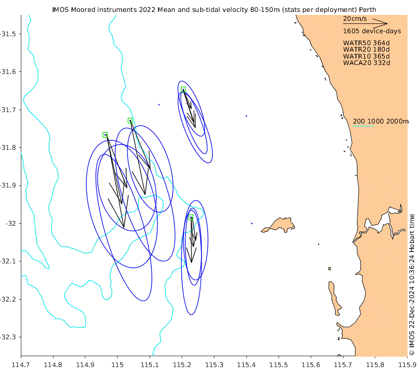 These maps show some basic analyses of the velocity data: mean (all-time in black and seasonal in colour) and sub-tidal variance for several layers and time-windows, and tidal harmonics for the depth-average velocity using the whole record. Click through to see more detailed plots of the selected dataset or to download those data from the AODN thredds server.