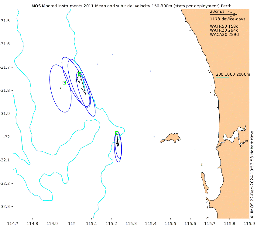 These maps show some basic analyses of the velocity data: mean (all-time in black and seasonal in colour) and sub-tidal variance for several layers and time-windows, and tidal harmonics for the depth-average velocity using the whole record. Click through to see more detailed plots of the selected dataset or to download those data from the AODN thredds server.