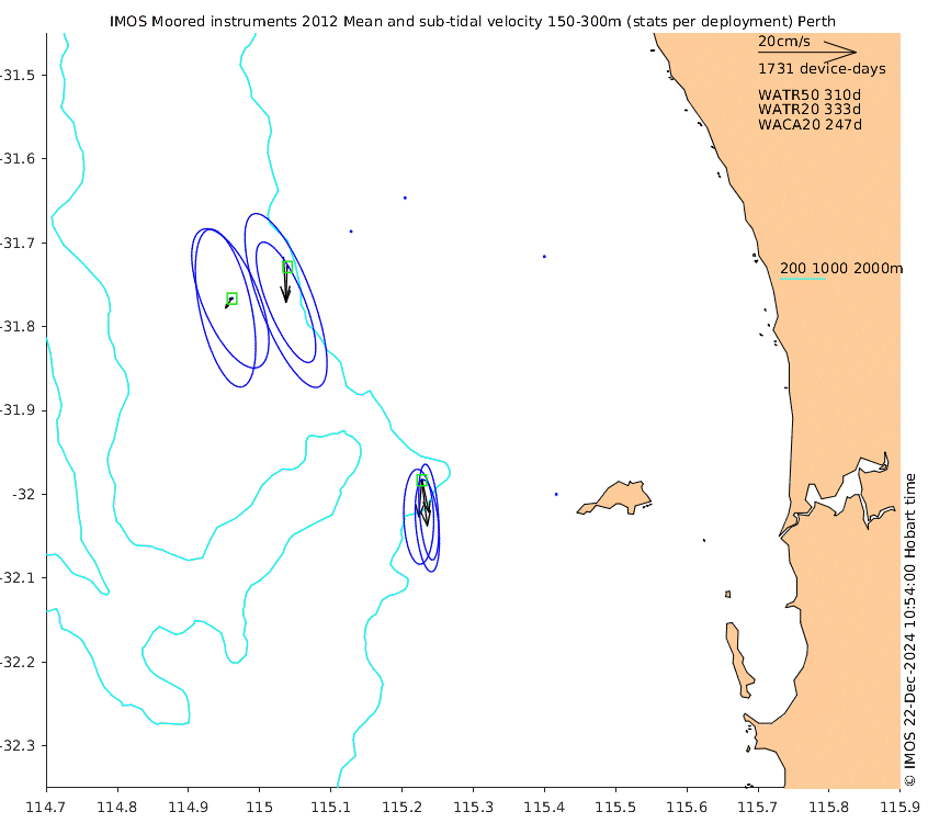 These maps show some basic analyses of the velocity data: mean (all-time in black and seasonal in colour) and sub-tidal variance for several layers and time-windows, and tidal harmonics for the depth-average velocity using the whole record. Click through to see more detailed plots of the selected dataset or to download those data from the AODN thredds server.