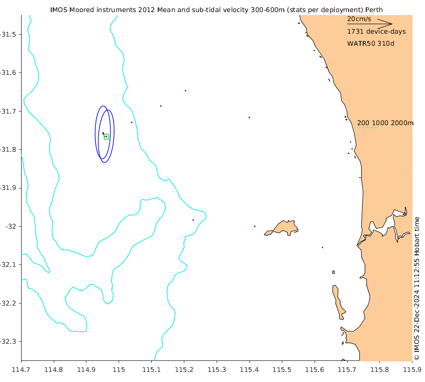 These maps show some basic analyses of the velocity data: mean (all-time in black and seasonal in colour) and sub-tidal variance for several layers and time-windows, and tidal harmonics for the depth-average velocity using the whole record. Click through to see more detailed plots of the selected dataset or to download those data from the AODN thredds server.
