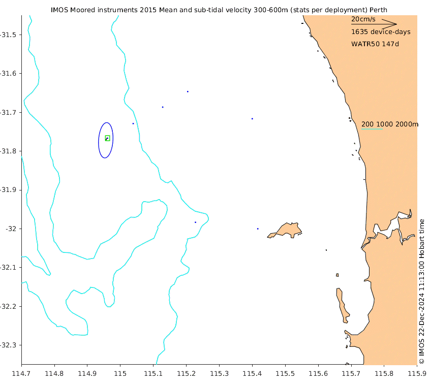 These maps show some basic analyses of the velocity data: mean (all-time in black and seasonal in colour) and sub-tidal variance for several layers and time-windows, and tidal harmonics for the depth-average velocity using the whole record. Click through to see more detailed plots of the selected dataset or to download those data from the AODN thredds server.