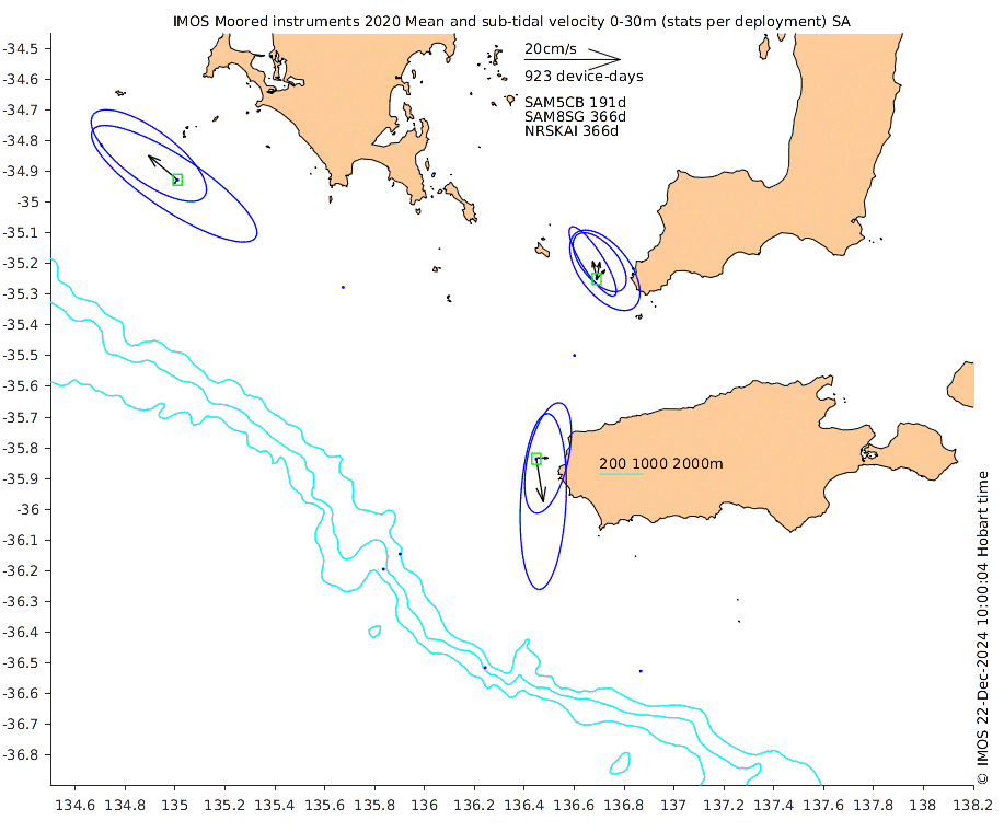 These maps show some basic analyses of the velocity data: mean (all-time in black and seasonal in colour) and sub-tidal variance for several layers and time-windows, and tidal harmonics for the depth-average velocity using the whole record. Click through to see more detailed plots of the selected dataset or to download those data from the AODN thredds server.
