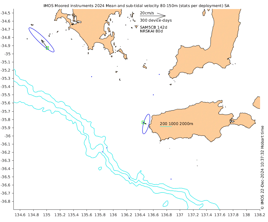 These maps show some basic analyses of the velocity data: mean (all-time in black and seasonal in colour) and sub-tidal variance for several layers and time-windows, and tidal harmonics for the depth-average velocity using the whole record. Click through to see more detailed plots of the selected dataset or to download those data from the AODN thredds server.
