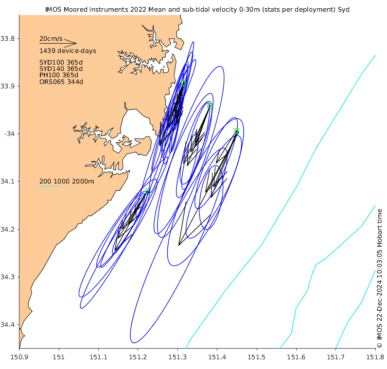 These maps show some basic analyses of the velocity data: mean (all-time in black and seasonal in colour) and sub-tidal variance for several layers and time-windows, and tidal harmonics for the depth-average velocity using the whole record. Click through to see more detailed plots of the selected dataset or to download those data from the AODN thredds server.