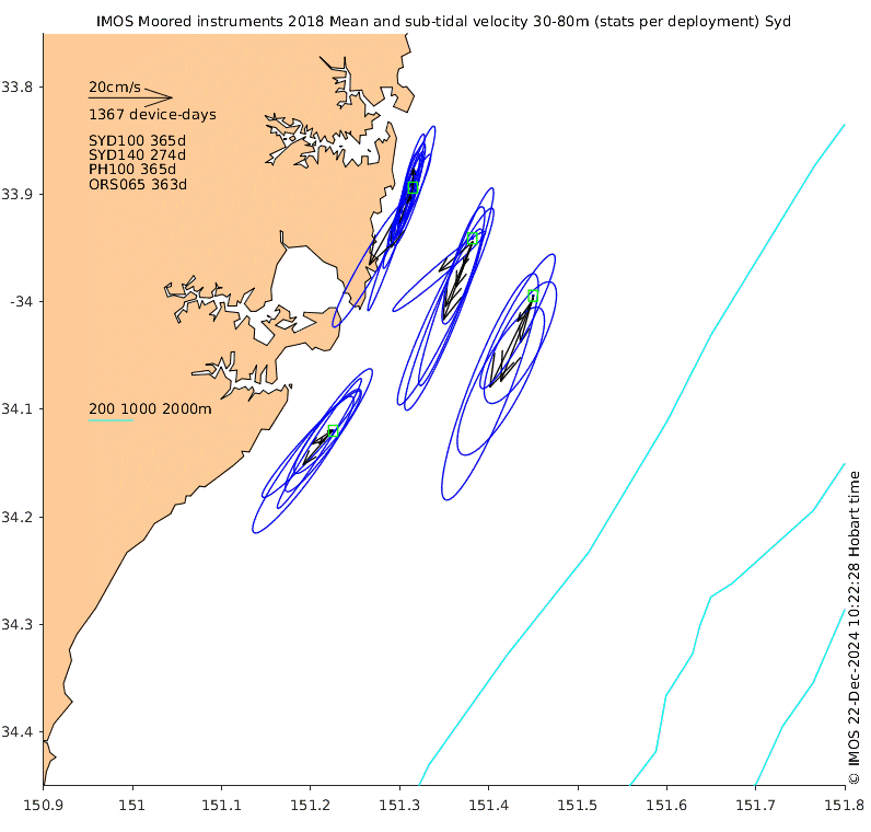 These maps show some basic analyses of the velocity data: mean (all-time in black and seasonal in colour) and sub-tidal variance for several layers and time-windows, and tidal harmonics for the depth-average velocity using the whole record. Click through to see more detailed plots of the selected dataset or to download those data from the AODN thredds server.