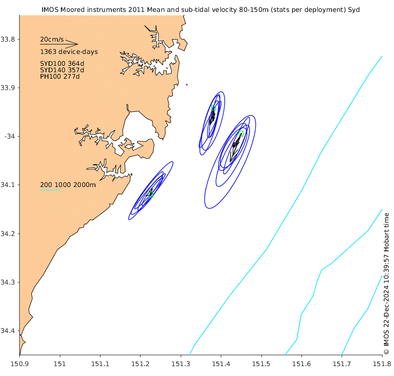 These maps show some basic analyses of the velocity data: mean (all-time in black and seasonal in colour) and sub-tidal variance for several layers and time-windows, and tidal harmonics for the depth-average velocity using the whole record. Click through to see more detailed plots of the selected dataset or to download those data from the AODN thredds server.