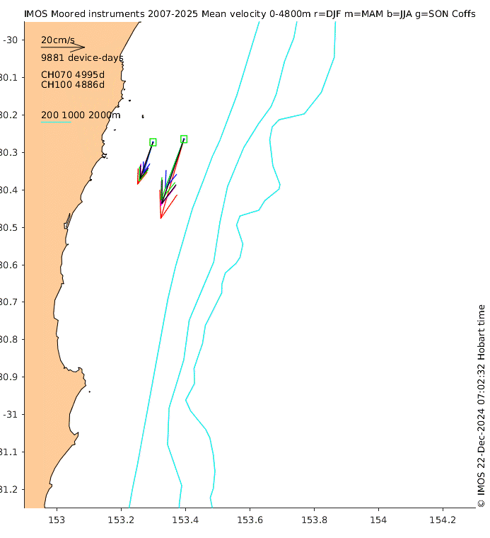 These maps show some basic analyses of the velocity data: mean (all-time in black and seasonal in colour) and sub-tidal variance for several layers and time-windows, and tidal harmonics for the depth-average velocity using the whole record. Click through to see more detailed plots of the selected dataset or to download those data from the AODN thredds server.