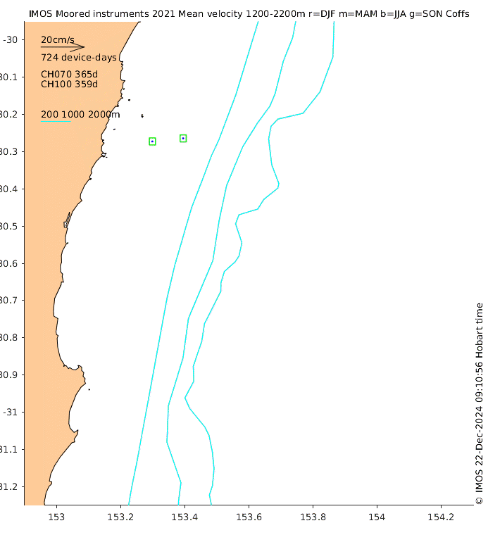 These maps show some basic analyses of the velocity data: mean (all-time in black and seasonal in colour) and sub-tidal variance for several layers and time-windows, and tidal harmonics for the depth-average velocity using the whole record. Click through to see more detailed plots of the selected dataset or to download those data from the AODN thredds server.