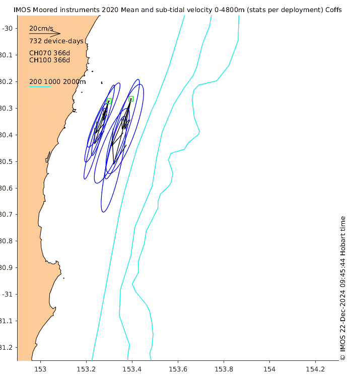 These maps show some basic analyses of the velocity data: mean (all-time in black and seasonal in colour) and sub-tidal variance for several layers and time-windows, and tidal harmonics for the depth-average velocity using the whole record. Click through to see more detailed plots of the selected dataset or to download those data from the AODN thredds server.