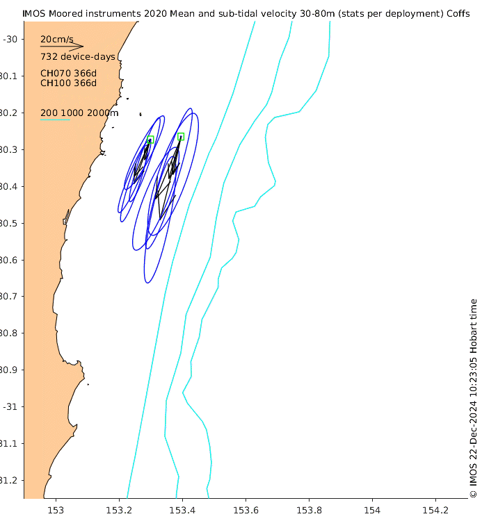 These maps show some basic analyses of the velocity data: mean (all-time in black and seasonal in colour) and sub-tidal variance for several layers and time-windows, and tidal harmonics for the depth-average velocity using the whole record. Click through to see more detailed plots of the selected dataset or to download those data from the AODN thredds server.