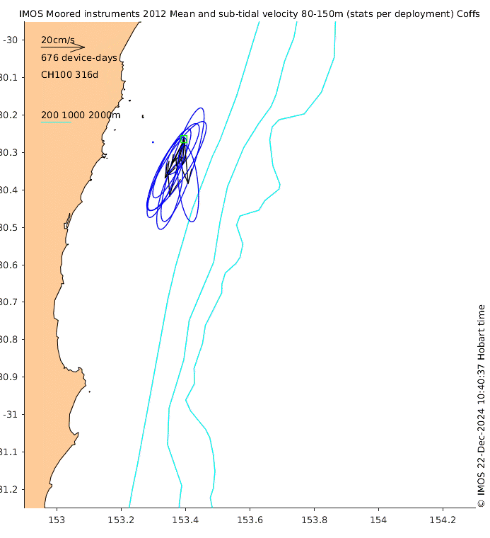 These maps show some basic analyses of the velocity data: mean (all-time in black and seasonal in colour) and sub-tidal variance for several layers and time-windows, and tidal harmonics for the depth-average velocity using the whole record. Click through to see more detailed plots of the selected dataset or to download those data from the AODN thredds server.