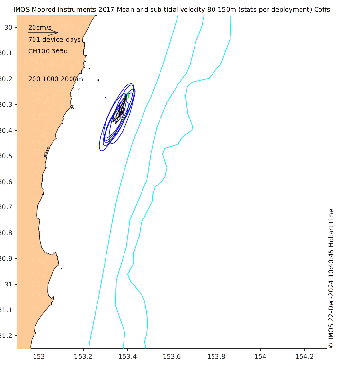 These maps show some basic analyses of the velocity data: mean (all-time in black and seasonal in colour) and sub-tidal variance for several layers and time-windows, and tidal harmonics for the depth-average velocity using the whole record. Click through to see more detailed plots of the selected dataset or to download those data from the AODN thredds server.