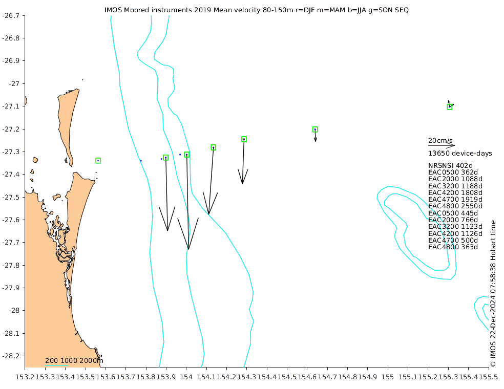 These maps show some basic analyses of the velocity data: mean (all-time in black and seasonal in colour) and sub-tidal variance for several layers and time-windows, and tidal harmonics for the depth-average velocity using the whole record. Click through to see more detailed plots of the selected dataset or to download those data from the AODN thredds server.
