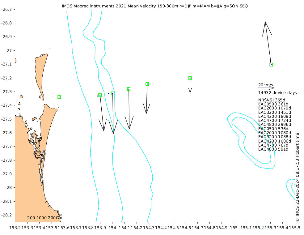 These maps show some basic analyses of the velocity data: mean (all-time in black and seasonal in colour) and sub-tidal variance for several layers and time-windows, and tidal harmonics for the depth-average velocity using the whole record. Click through to see more detailed plots of the selected dataset or to download those data from the AODN thredds server.