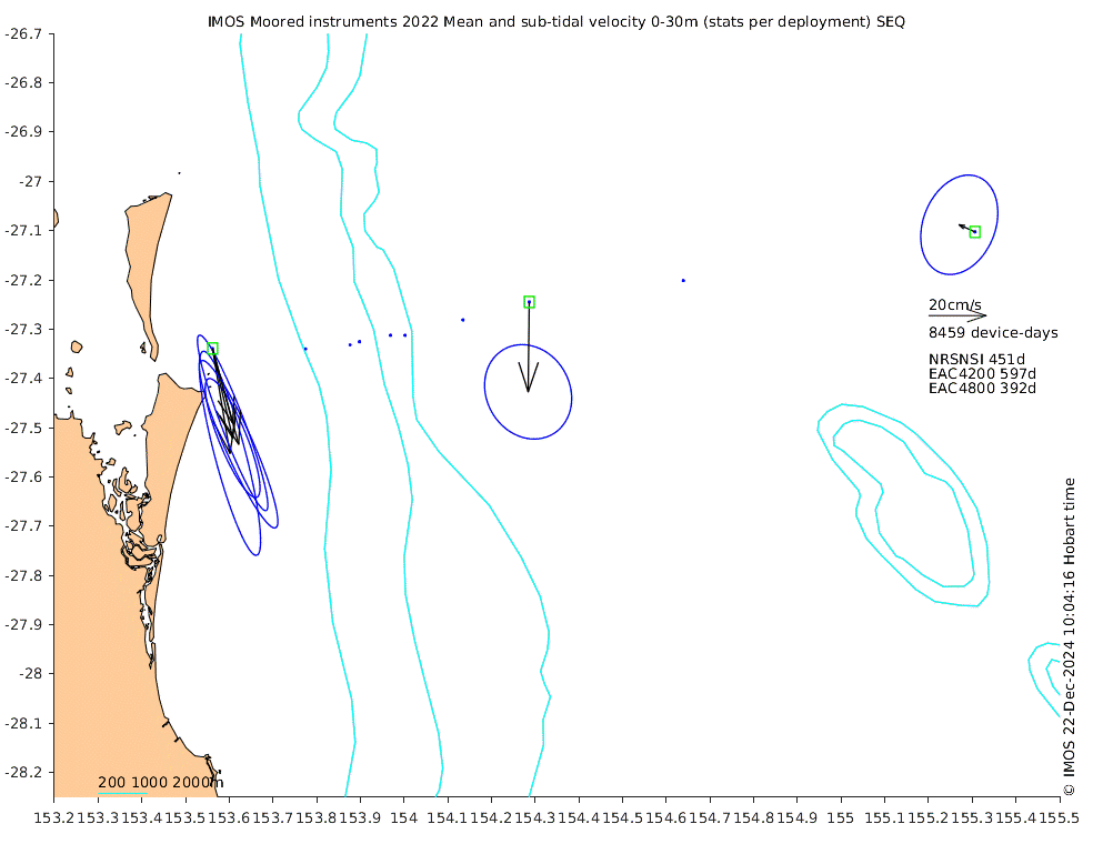 These maps show some basic analyses of the velocity data: mean (all-time in black and seasonal in colour) and sub-tidal variance for several layers and time-windows, and tidal harmonics for the depth-average velocity using the whole record. Click through to see more detailed plots of the selected dataset or to download those data from the AODN thredds server.