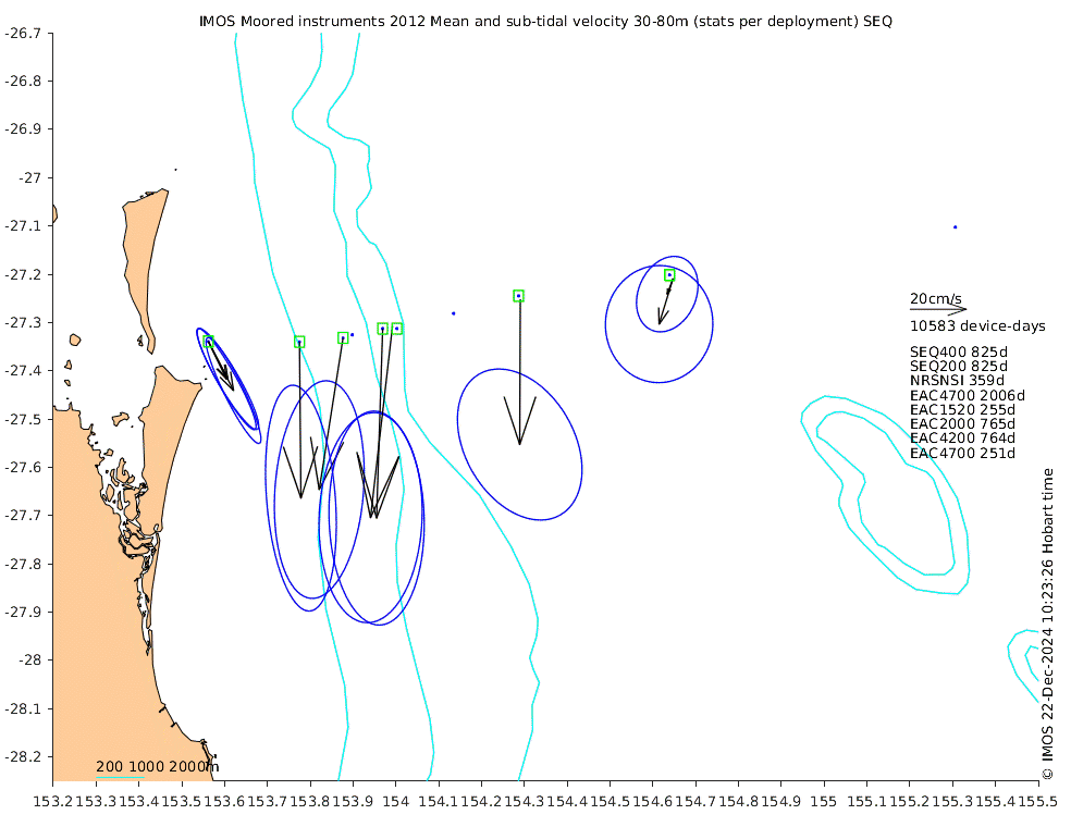 These maps show some basic analyses of the velocity data: mean (all-time in black and seasonal in colour) and sub-tidal variance for several layers and time-windows, and tidal harmonics for the depth-average velocity using the whole record. Click through to see more detailed plots of the selected dataset or to download those data from the AODN thredds server.