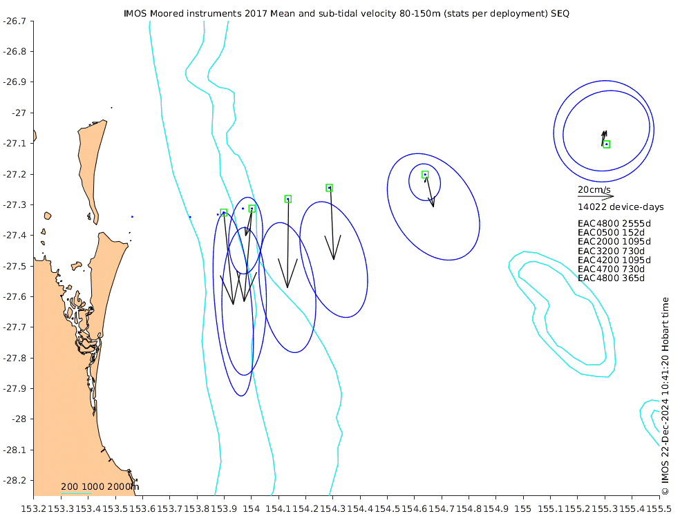 These maps show some basic analyses of the velocity data: mean (all-time in black and seasonal in colour) and sub-tidal variance for several layers and time-windows, and tidal harmonics for the depth-average velocity using the whole record. Click through to see more detailed plots of the selected dataset or to download those data from the AODN thredds server.