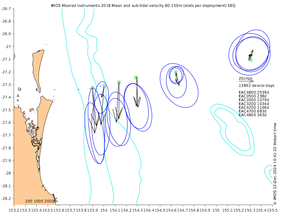 These maps show some basic analyses of the velocity data: mean (all-time in black and seasonal in colour) and sub-tidal variance for several layers and time-windows, and tidal harmonics for the depth-average velocity using the whole record. Click through to see more detailed plots of the selected dataset or to download those data from the AODN thredds server.