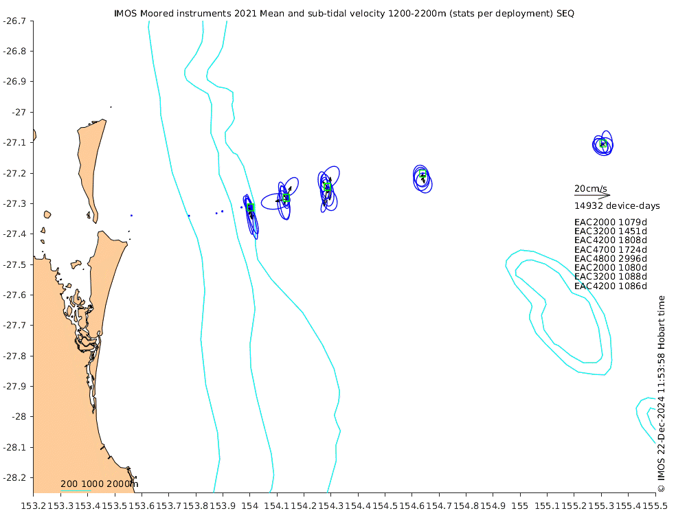 These maps show some basic analyses of the velocity data: mean (all-time in black and seasonal in colour) and sub-tidal variance for several layers and time-windows, and tidal harmonics for the depth-average velocity using the whole record. Click through to see more detailed plots of the selected dataset or to download those data from the AODN thredds server.