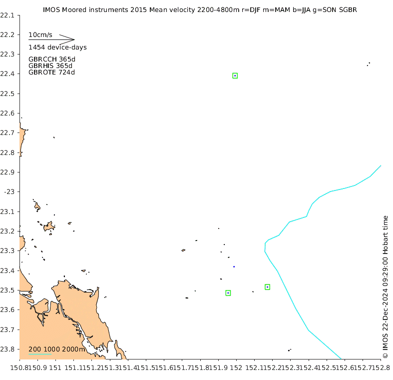 These maps show some basic analyses of the velocity data: mean (all-time in black and seasonal in colour) and sub-tidal variance for several layers and time-windows, and tidal harmonics for the depth-average velocity using the whole record. Click through to see more detailed plots of the selected dataset or to download those data from the AODN thredds server.