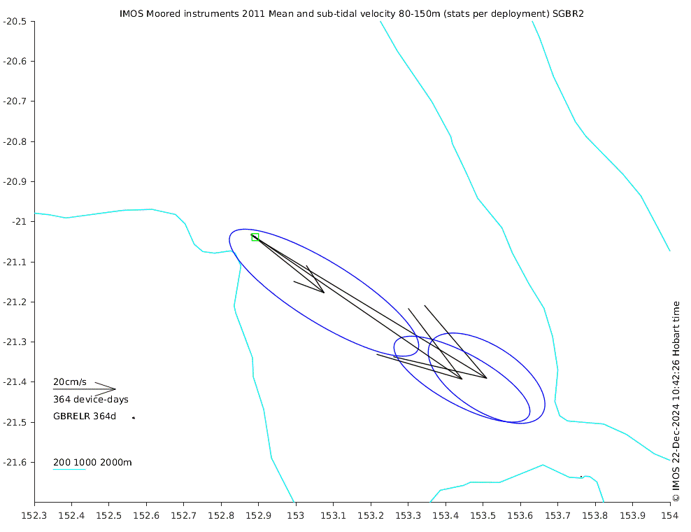These maps show some basic analyses of the velocity data: mean (all-time in black and seasonal in colour) and sub-tidal variance for several layers and time-windows, and tidal harmonics for the depth-average velocity using the whole record. Click through to see more detailed plots of the selected dataset or to download those data from the AODN thredds server.