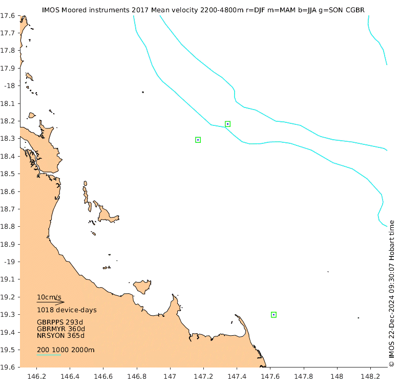 These maps show some basic analyses of the velocity data: mean (all-time in black and seasonal in colour) and sub-tidal variance for several layers and time-windows, and tidal harmonics for the depth-average velocity using the whole record. Click through to see more detailed plots of the selected dataset or to download those data from the AODN thredds server.