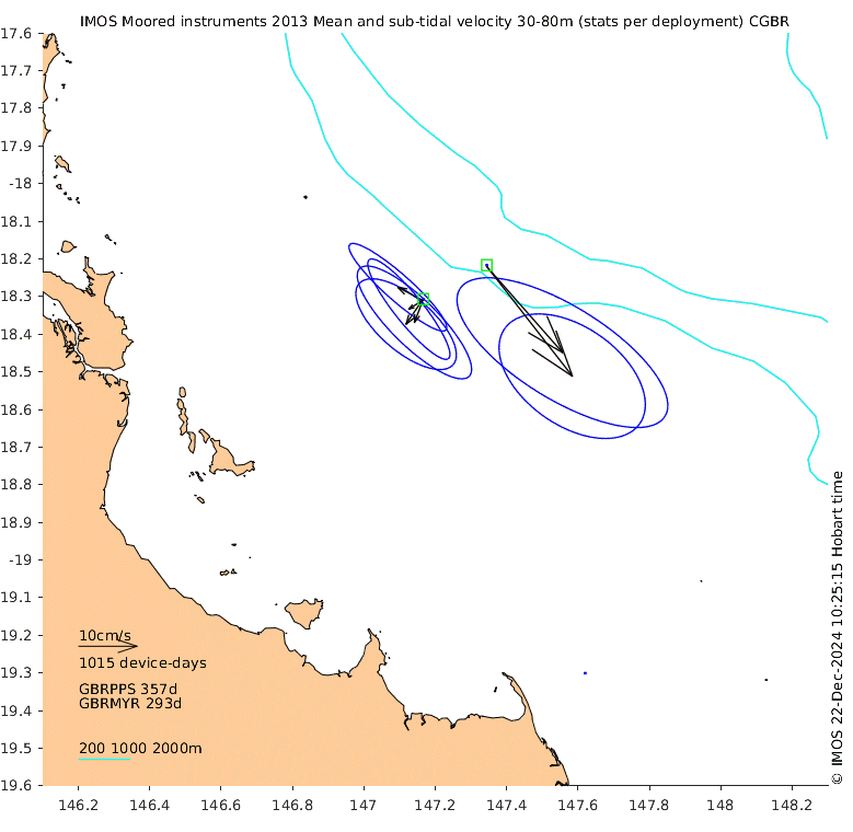These maps show some basic analyses of the velocity data: mean (all-time in black and seasonal in colour) and sub-tidal variance for several layers and time-windows, and tidal harmonics for the depth-average velocity using the whole record. Click through to see more detailed plots of the selected dataset or to download those data from the AODN thredds server.