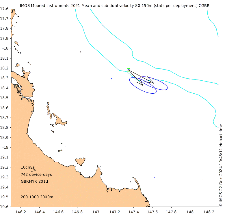 These maps show some basic analyses of the velocity data: mean (all-time in black and seasonal in colour) and sub-tidal variance for several layers and time-windows, and tidal harmonics for the depth-average velocity using the whole record. Click through to see more detailed plots of the selected dataset or to download those data from the AODN thredds server.