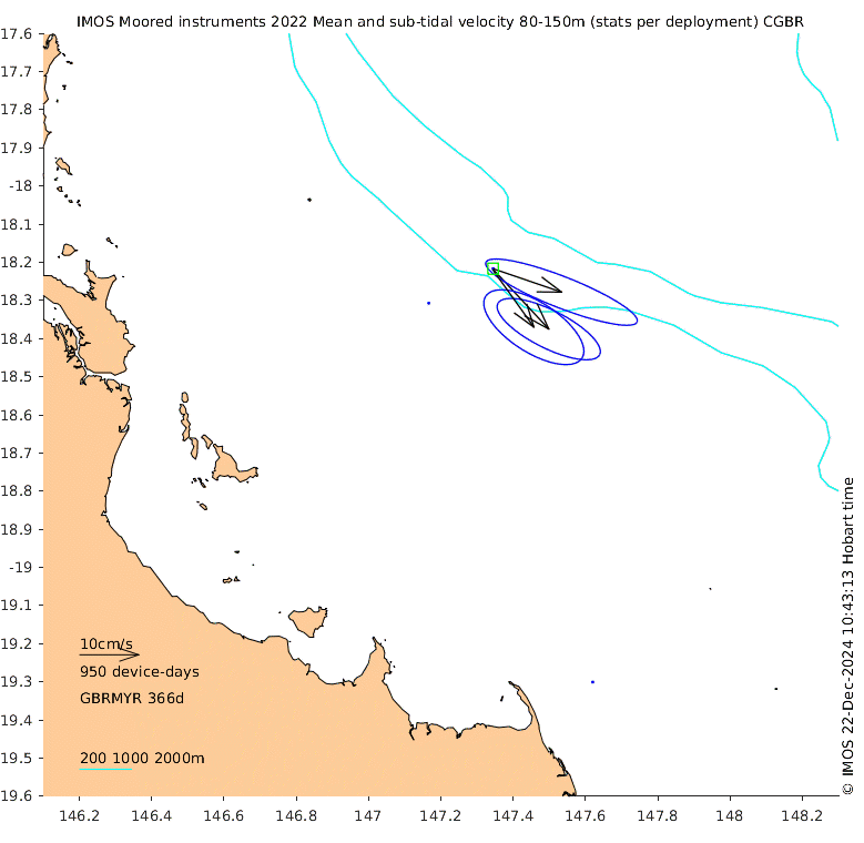 These maps show some basic analyses of the velocity data: mean (all-time in black and seasonal in colour) and sub-tidal variance for several layers and time-windows, and tidal harmonics for the depth-average velocity using the whole record. Click through to see more detailed plots of the selected dataset or to download those data from the AODN thredds server.