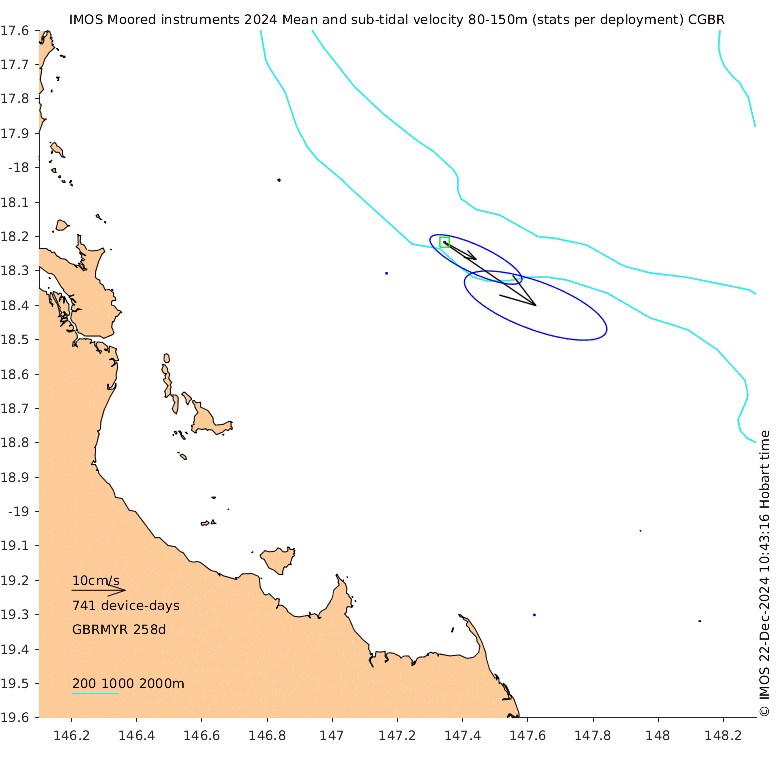 These maps show some basic analyses of the velocity data: mean (all-time in black and seasonal in colour) and sub-tidal variance for several layers and time-windows, and tidal harmonics for the depth-average velocity using the whole record. Click through to see more detailed plots of the selected dataset or to download those data from the AODN thredds server.