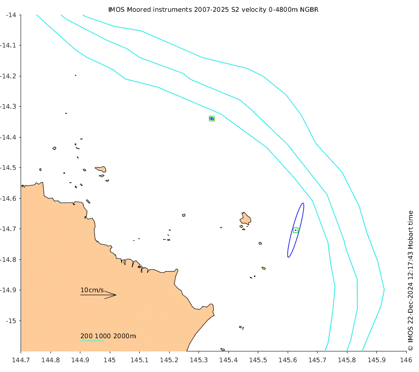 These maps show some basic analyses of the velocity data: mean (all-time in black and seasonal in colour) and sub-tidal variance for several layers and time-windows, and tidal harmonics for the depth-average velocity using the whole record. Click through to see more detailed plots of the selected dataset or to download those data from the AODN thredds server.