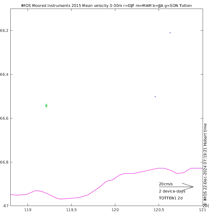 These maps show some basic analyses of the velocity data: mean (all-time in black and seasonal in colour) and sub-tidal variance for several layers and time-windows, and tidal harmonics for the depth-average velocity using the whole record. Click through to see more detailed plots of the selected dataset or to download those data from the AODN thredds server.