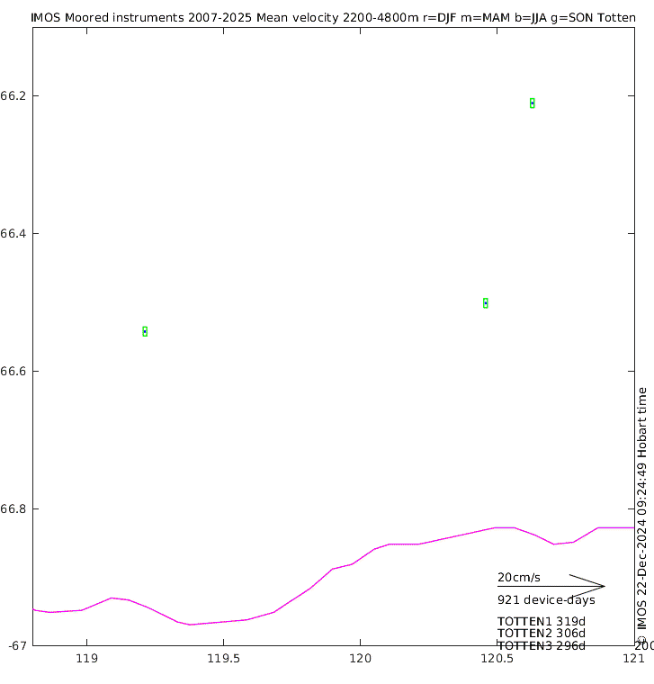 These maps show some basic analyses of the velocity data: mean (all-time in black and seasonal in colour) and sub-tidal variance for several layers and time-windows, and tidal harmonics for the depth-average velocity using the whole record. Click through to see more detailed plots of the selected dataset or to download those data from the AODN thredds server.