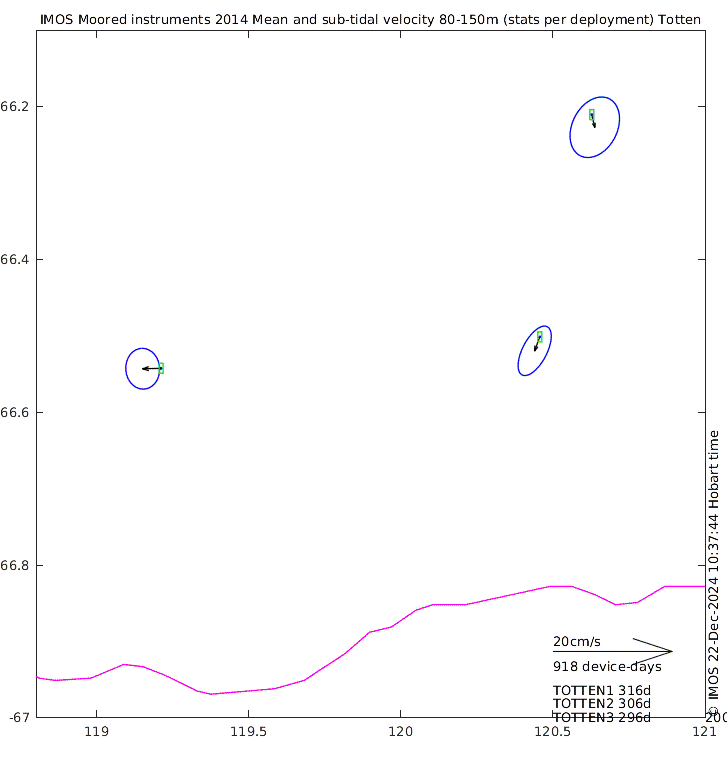 These maps show some basic analyses of the velocity data: mean (all-time in black and seasonal in colour) and sub-tidal variance for several layers and time-windows, and tidal harmonics for the depth-average velocity using the whole record. Click through to see more detailed plots of the selected dataset or to download those data from the AODN thredds server.