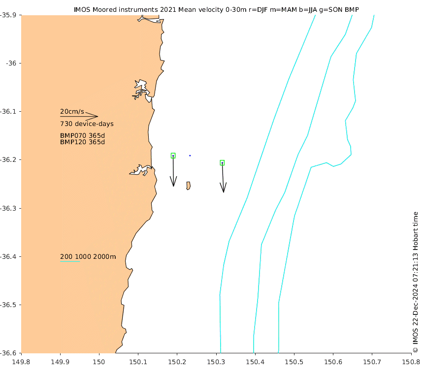 These maps show some basic analyses of the velocity data: mean (all-time in black and seasonal in colour) and sub-tidal variance for several layers and time-windows, and tidal harmonics for the depth-average velocity using the whole record. Click through to see more detailed plots of the selected dataset or to download those data from the AODN thredds server.
