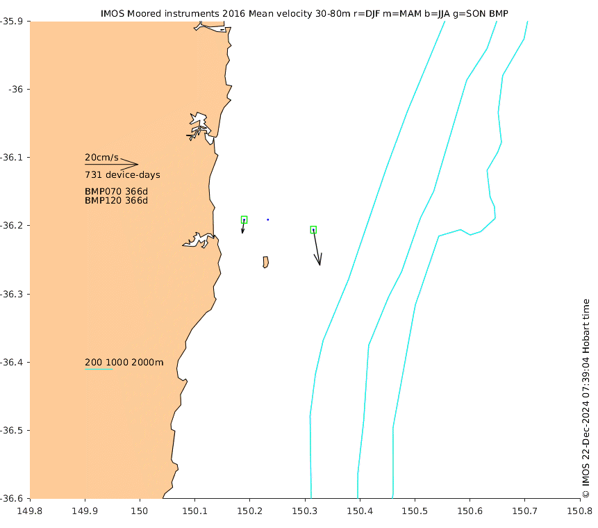 These maps show some basic analyses of the velocity data: mean (all-time in black and seasonal in colour) and sub-tidal variance for several layers and time-windows, and tidal harmonics for the depth-average velocity using the whole record. Click through to see more detailed plots of the selected dataset or to download those data from the AODN thredds server.